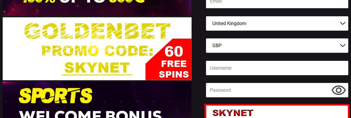 - Enter personal details and the Goldenbet promo code field. Type SKYNET and click “Register”.